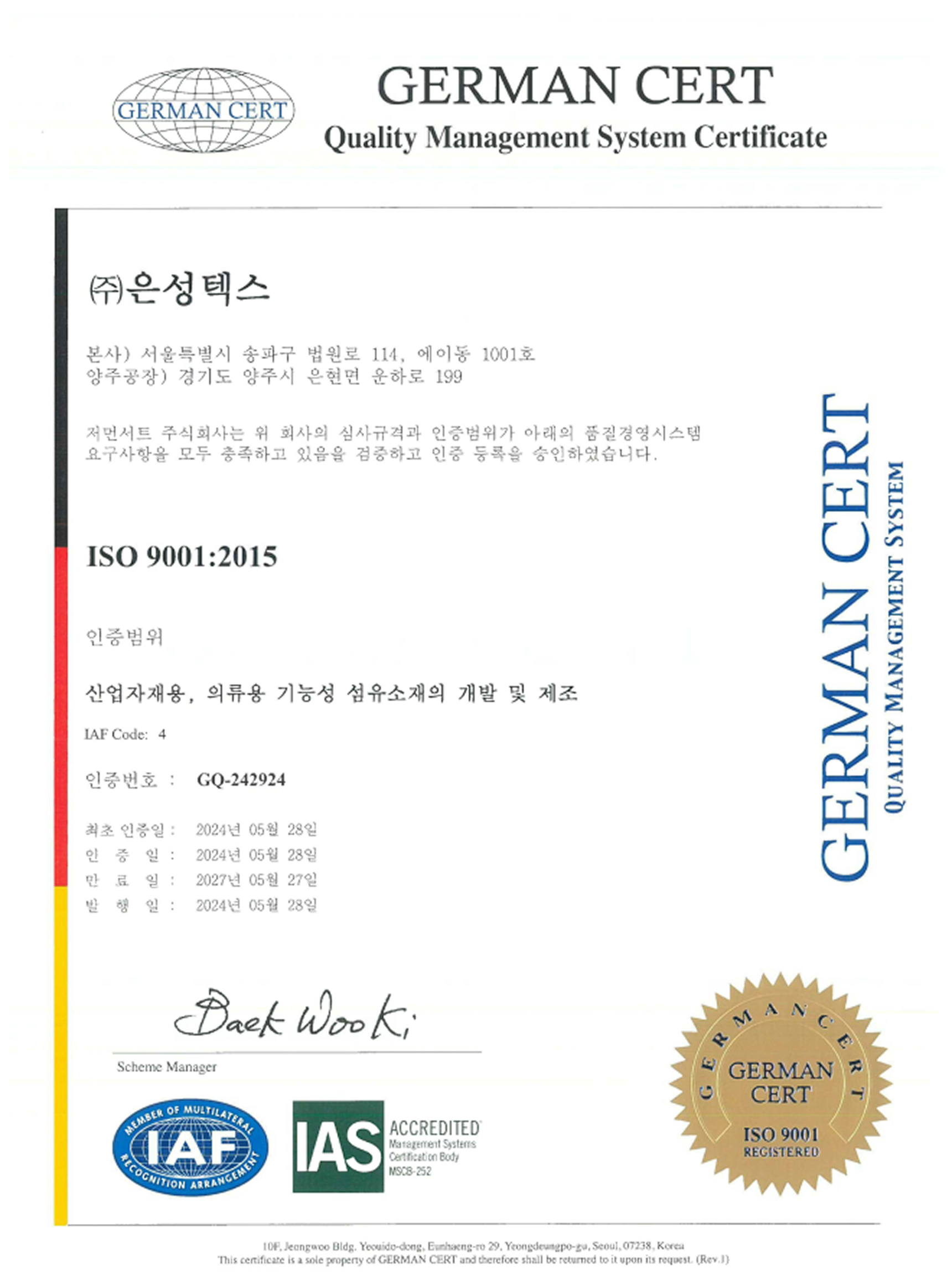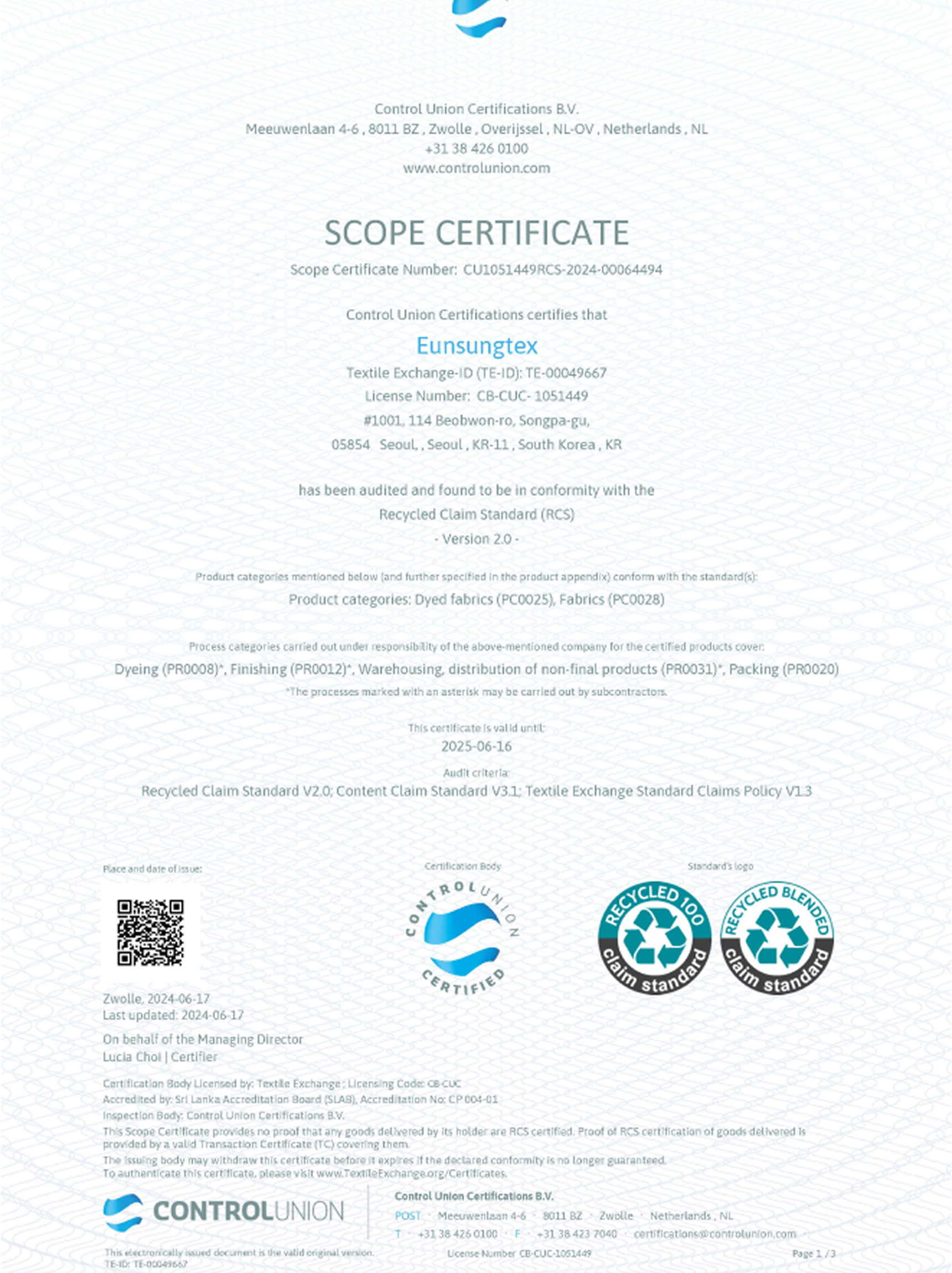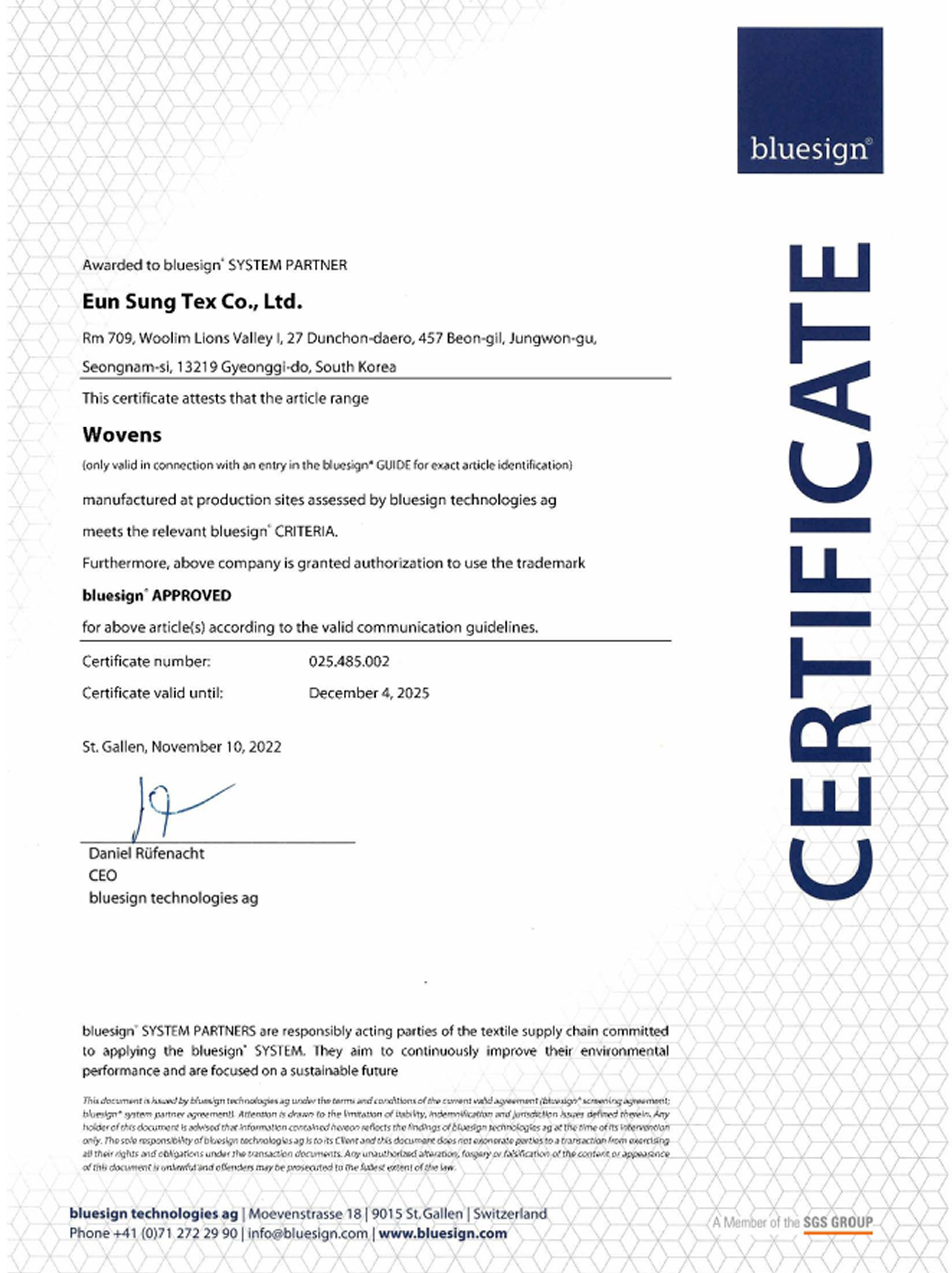 bluesign®, RCS, Higg Index, ISO 9001, 14001, 45001 등 국제 친환경 인증을 바탕으로 환경과 조화를 이루는 생산 시스템을 구축해 나가고 있습니다.